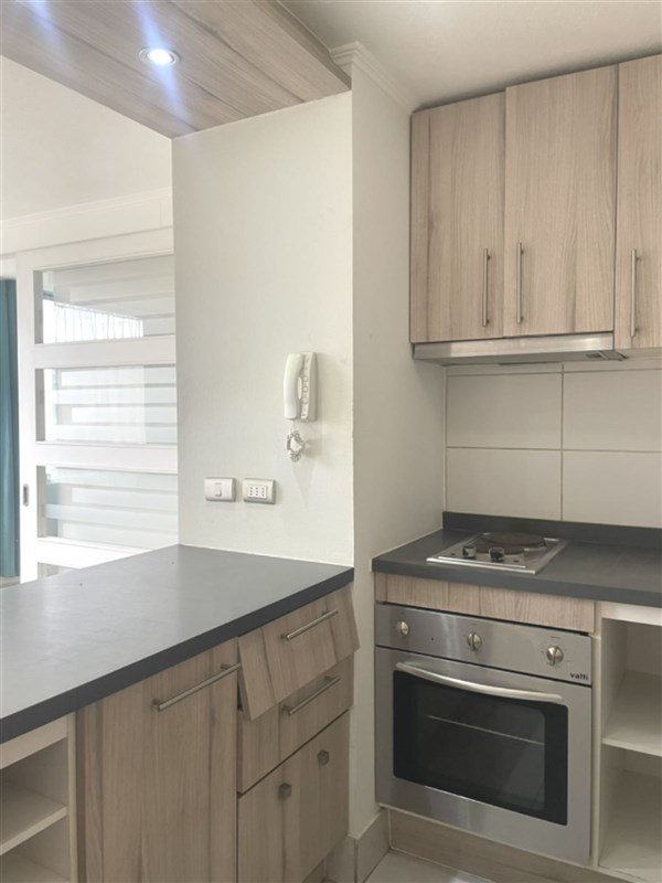 Cocina americana equipada con horno eléctrico, encimera y campana. Piso cerámico.-