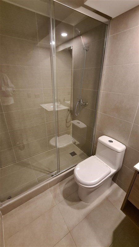 Baño principal con receptáculo de ducha y mampara de cristal.