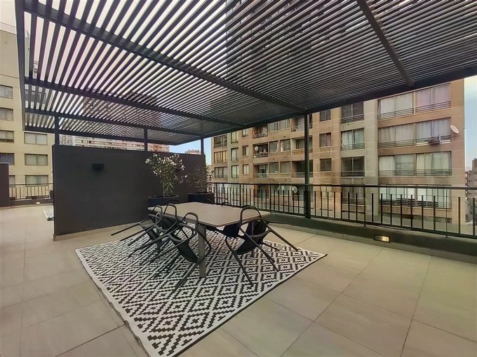 El condominio ofrece una amplia variedad de espacios comunes, incluyendo piscina, gimnasio, salón de eventos, y terraza con quincho y vista panorámica en el décimo piso. Además, el edificio cuenta con conserjeria 24/7 y estacionamientos de visitas.