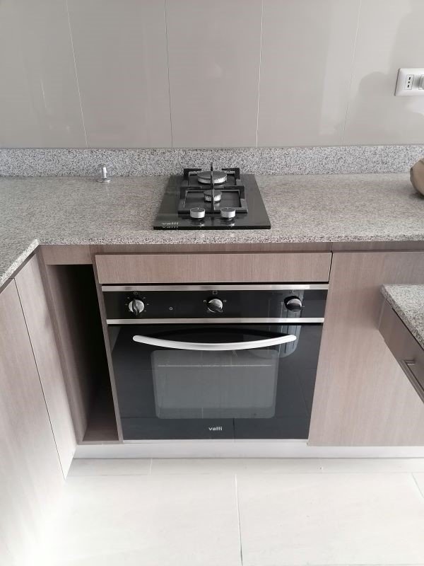 Living con balcón, cocina americana, con encimera de 2 platos a gas, horno empotrado eléctrico, almacenamiento, mesada, closet tipo despensa, instalación de lavadora, espacio para refrigerador.
