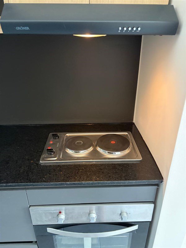 Cocina con cubierta de granito, equipada con: horno, encimera eléctrica y campana.