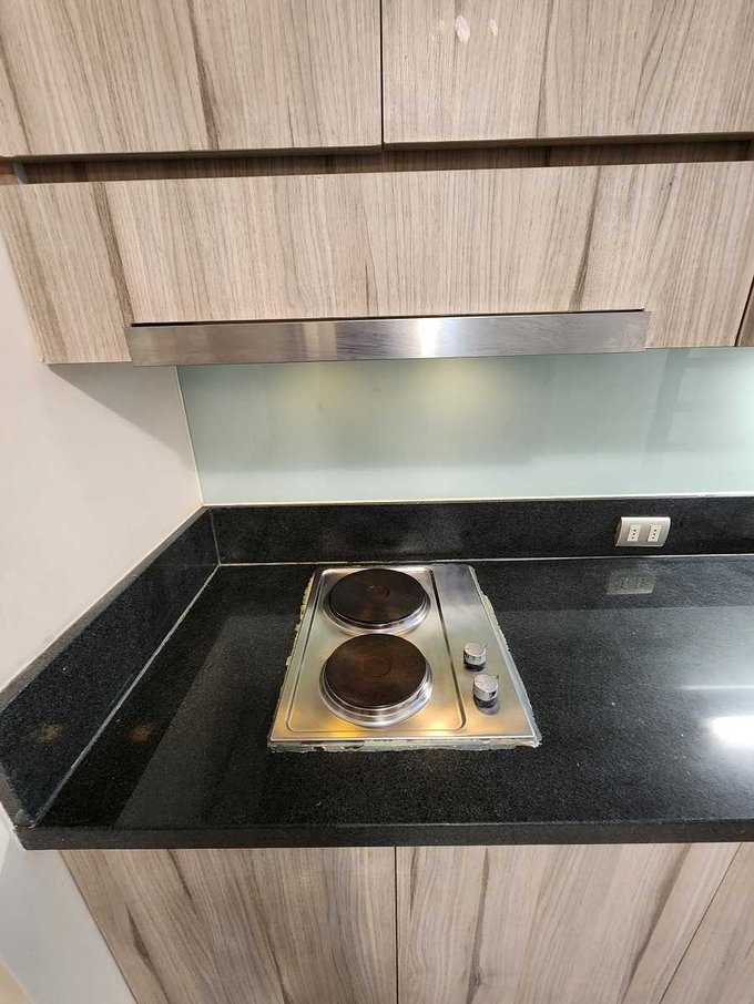 Cuenta con cocina integrada con Horno eléctrico, encimera eléctrica de 2 platos, campana de extracción forzada
