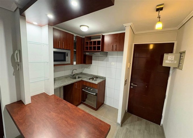 Cuenta con una amplia habitación en suite, un baño completo, conexión para lavadora, cocina americana equipada con encimera de 2 hornillas, microondas, campana y horno eléctrico. Living comedor con salida hacia una luminosa terraza con vista hacia la calle, ventanas termopanel y piso flotante en todo el departamento. Gastos comunes 70.000 Aprox.