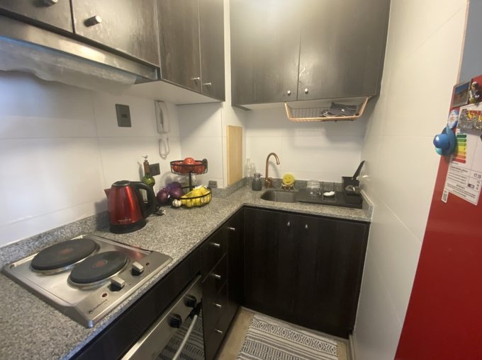 Cocina cerrada con encimera, horno y campana