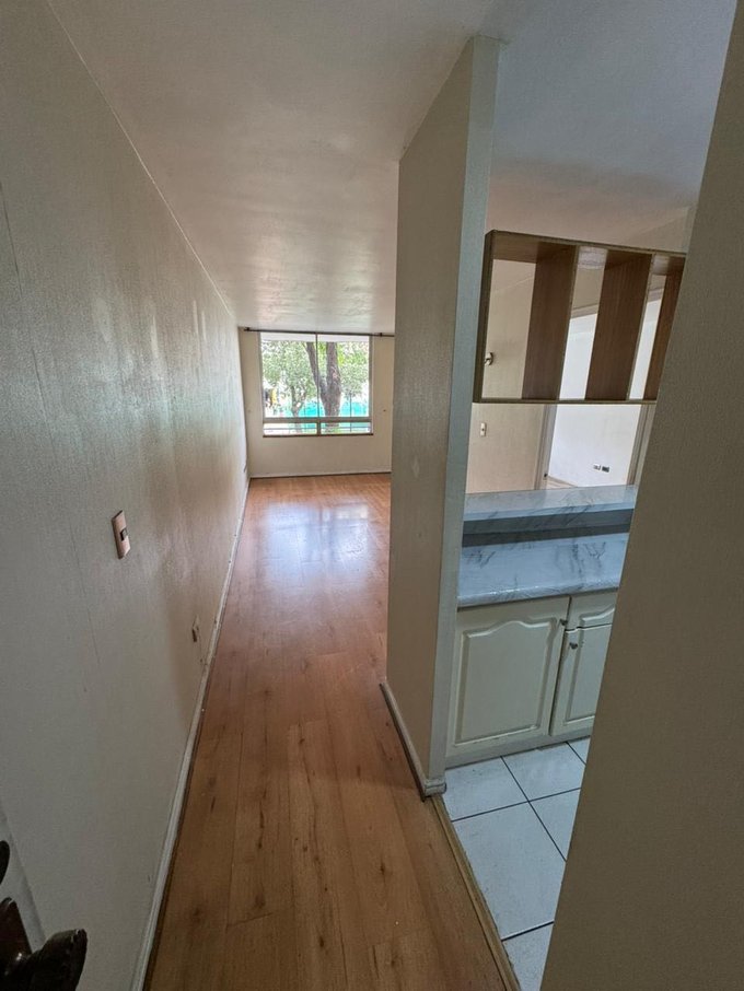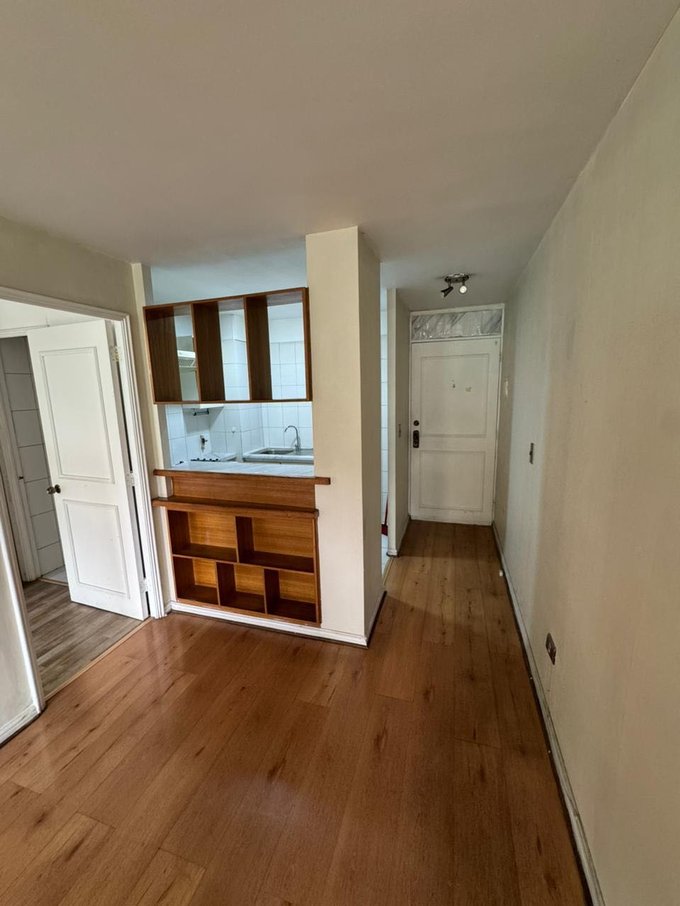 Pasillo de entrada y amplio living comedor muy luminoso. Gran dormitorio en suite con closet y baño completo. Todo el departamento tiene piso flotante. . Cocina con encimera y horno eléctrico, campana. El departamento se encuentra en muy buen estado.