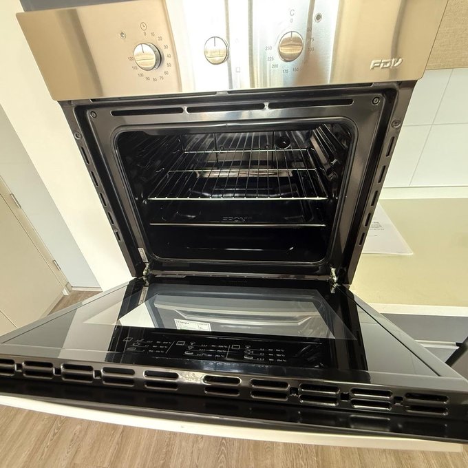 Campana, horno eléctrico, refrigerador y freezer, lámparas y cortinas roller.
