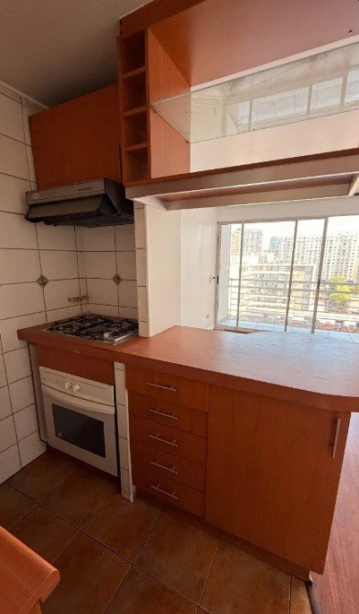 La cocina está equipada con muebles superiores e inferiores, encimera a gas y horno eléctrico, además de un mezón que facilita la integración con el área social.