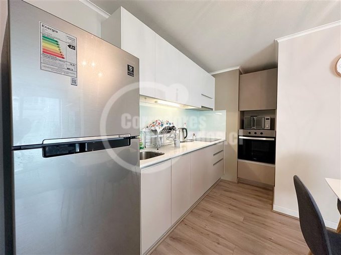 - Cocina amoblada, equipada con encimera vitrocerámica, horno eléctrico, refrigerador y campana,