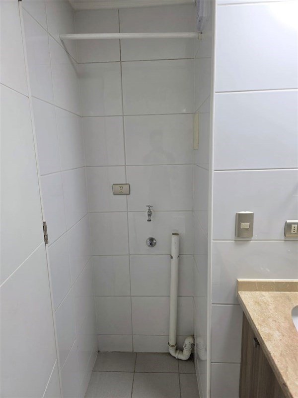 Baño completo: Con vanitorio de mármol y muros de cerámica.