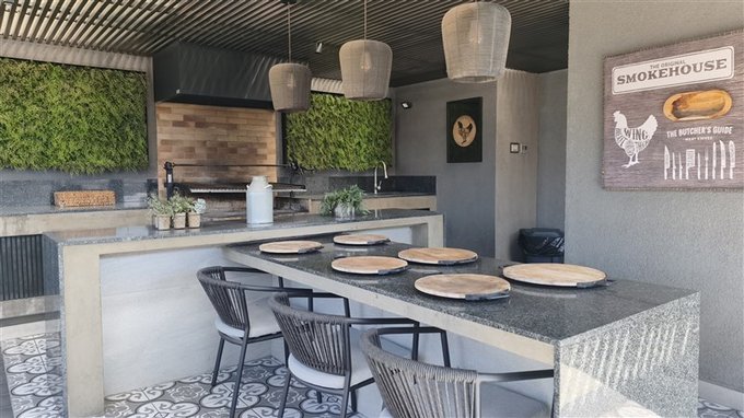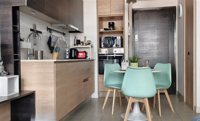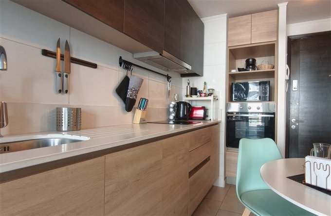 - Cocina americana amoblada con campana, cocina a gas y horno.