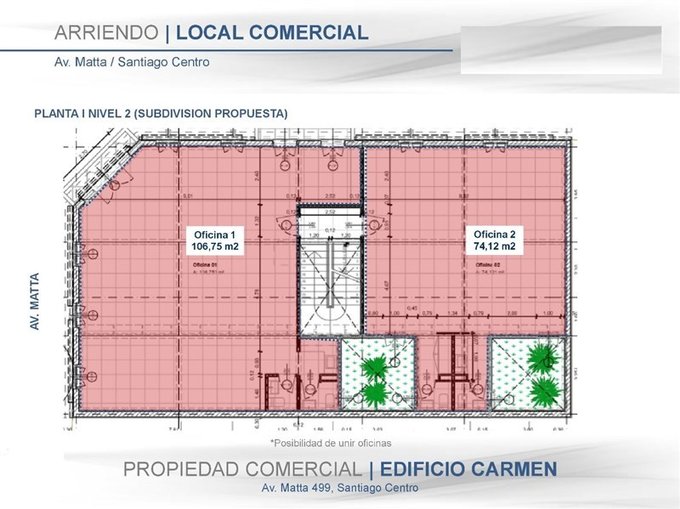 Se trata de 2 oficinas ubicadas en un 2 piso de un edificio nuevo en av. Matta esquina con carmen todo de uso comercial a 350mts del metro estación matta.