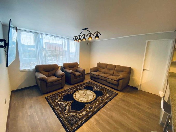 Living incluye sillones, cocina integrada y equipada (encimera, horno, campana y refrigerador), comedor diario con tres sillas