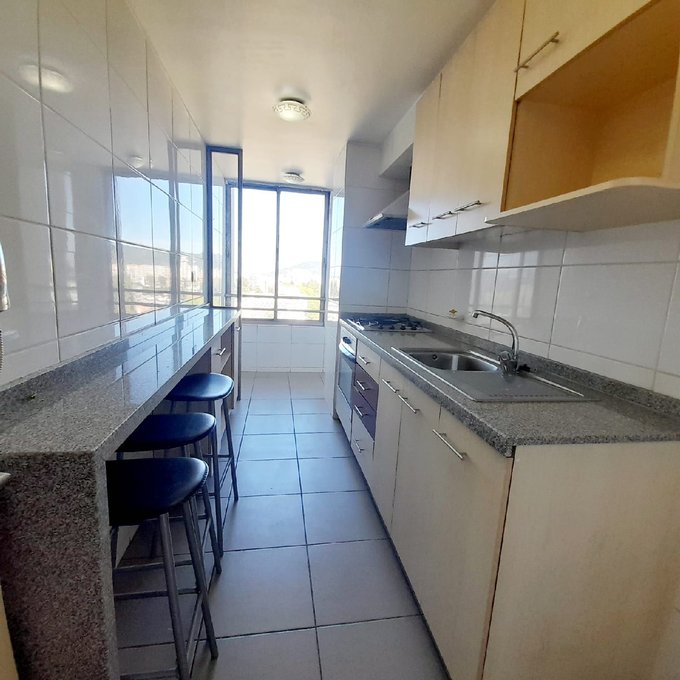 Cocina amoblada, extractor de aire, lavaplatos, horno y cocina a gas.