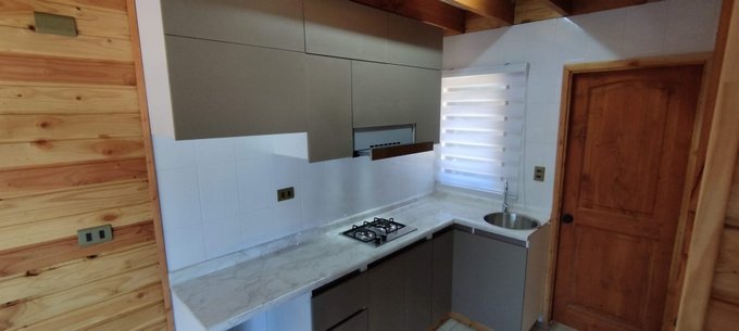 Cocina con muebles, encimera a gas y extractor.