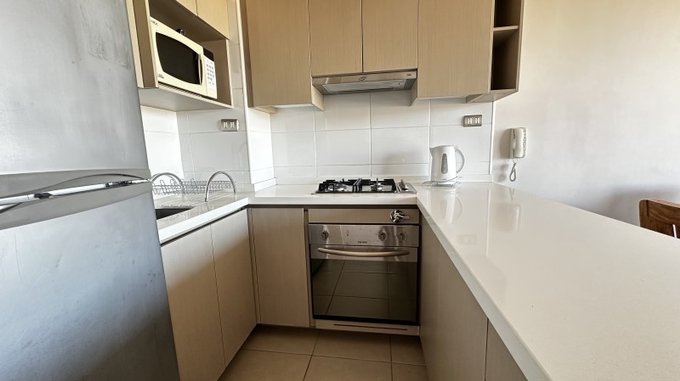 Cocina con encimera de granito, horno, microondas y cocina empotrados. Campana eléctrica.