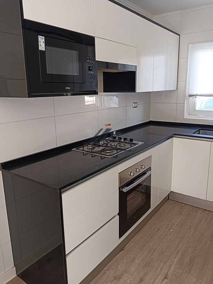 Cocina equipada con cubierta de mármol negro, horno, campana y encimera vitrocerámica