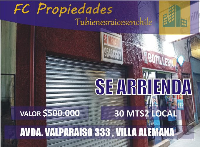 Se arrienda local comercial ubicado en Avenida Valparaíso 333, sector Troncal, zona de alto flujo peatonal y vehicular, rodeada de comercio, servicios y trámites diarios.Características del local:Superficie: 34 m²Medidas: 3,4 m de ancho x 10 m de largo1 bañoLavaplatosDistribución rectangular, fácil de adaptarIdeal para comercio, servicios, oficina o emprendimientos gastronómicos ligerosEntorno cercano:Sector gastronómicoGimnasioColegioEstación de servicio ShellRegistro CivilNotaríaZona con movimiento constante y excelente visibilidad comercial.Disponibilidad: InmediataRequisitos: acreditar renta y contar con avalAl ingresar se cancela: arriendo + garantía + comisiónPara mayor información o coordinar visita:WhatsApp +56 9 5431 3373