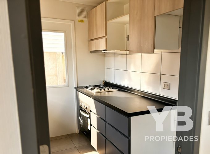 Cocina independiente con salida al patio, equipada con muebles, cocina y horno eléctrico
