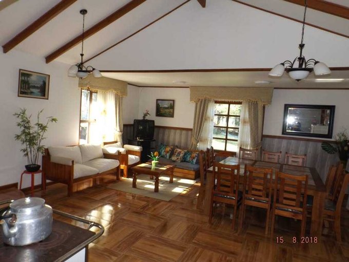 Amplio living comedor con excelente iluminación natural y vista al jardín, piscinas y bosque