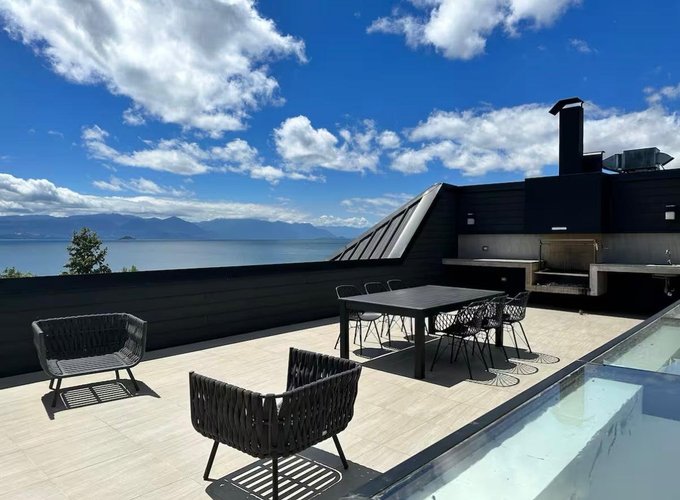Grupo Lake tiene disponible en Arriendo hermoso Departamento como nuevo y Amoblado frente a Lago Villarrica y con vistas a jardín y piscina. Ubicado en pleno Centro cerca de todo el comercio de Villarrica.