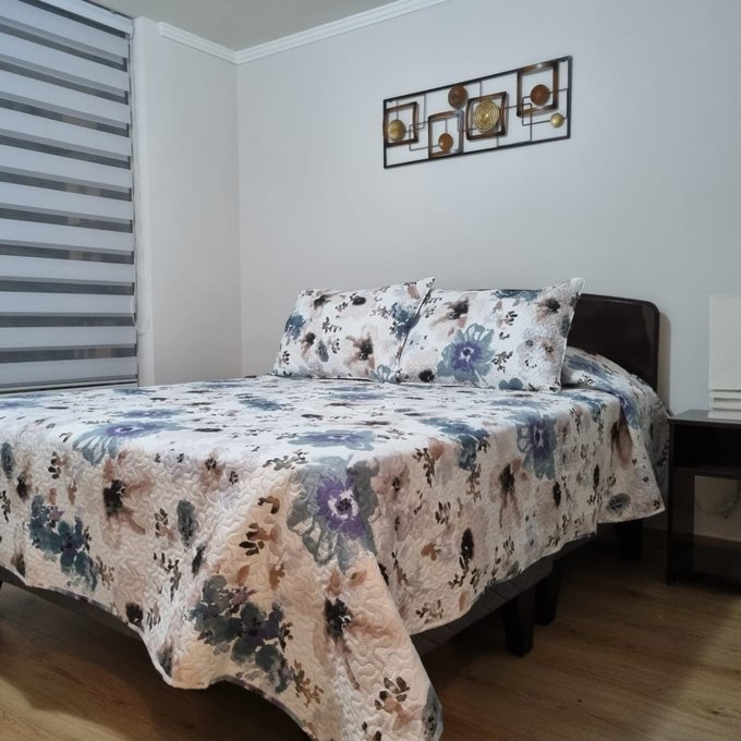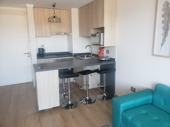 Cocina Americana equipada, con horno microondas, refrigerador, cocina eléctrica piso flotante en todo el departamento. Ventanales con termopaneles en todo el departamento, adempas con amplia terraza.