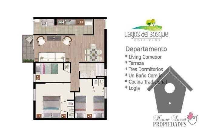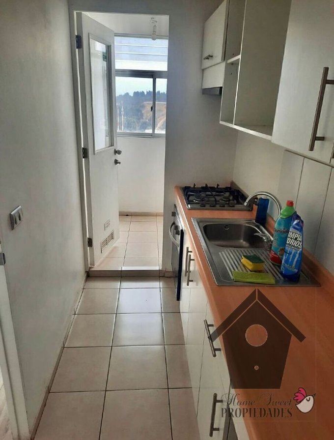 Piso flotante en estar comedor y pasillos. Alfombras en dormitorios. Cerámica en piso de baños, cocina y terraza. Ventanas con marcos de Aluminio anodizado mate. Baño con ventana. Cocina amoblada y equipada con encimera, horno eléctrico empotrado y campana. Closet en los dormitorios. Agua caliente con cálefon en la logia.