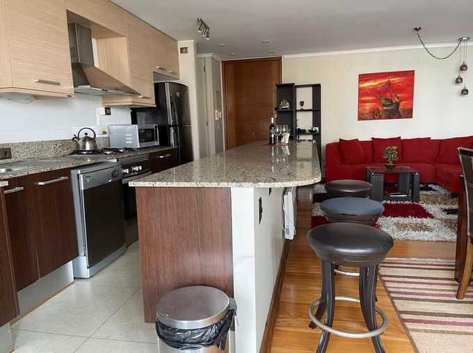 El departamento está amoblado y cuenta con 2 amplios dormitorios y 2 baños, principal en suite y con walking closet. Living comedor amoblado con cocina integrada amoblada con cubiertas de granito y amplia isla, equipada con refrigerador, encimera a gas, horno eléctrico, microondas y campana. Instalación para lavadora. Amplia terraza con vista que recorre todo el departamento. Incluye un estacionamiento.