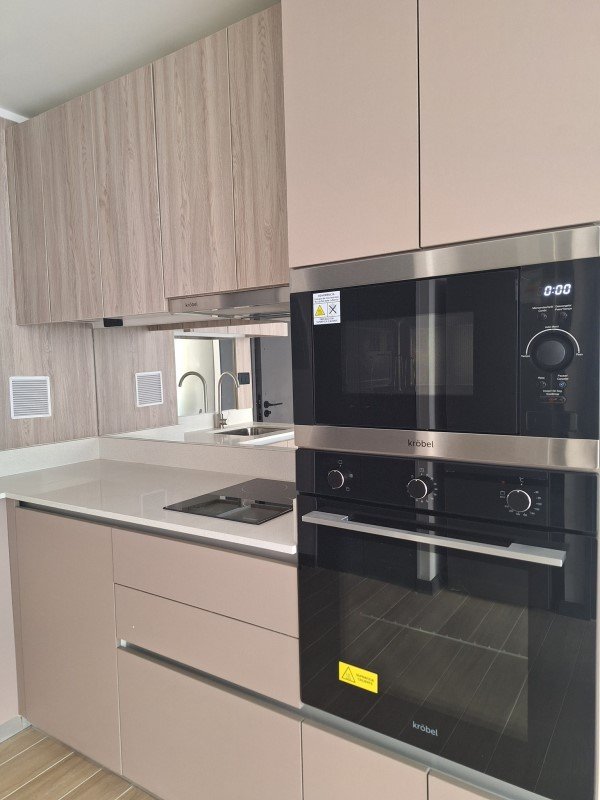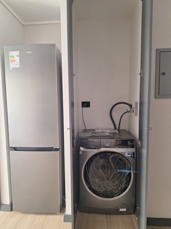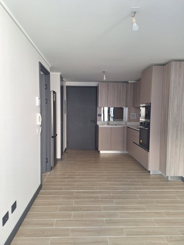 El departamento tiene 1 dormitorio, baño en suite y cocina integrada. Cuenta con encimera de vitrocerámica, campana extraíble, horno eléctrico, microondas, refrigerador y lavadora-secadora.