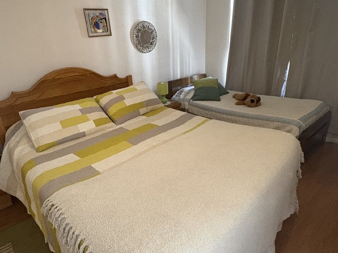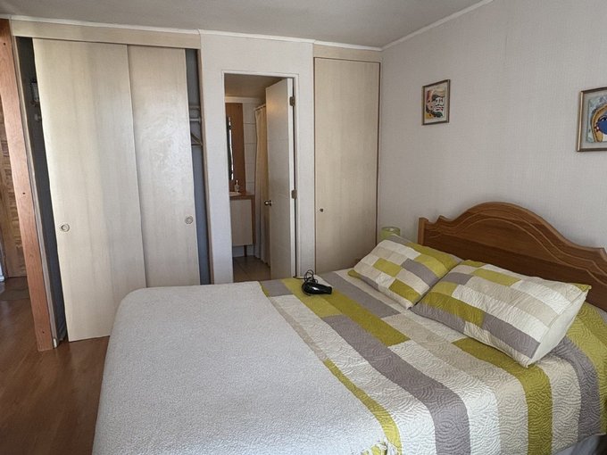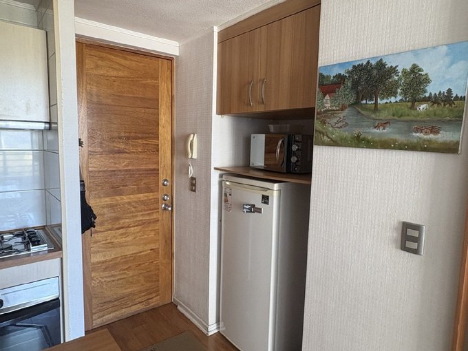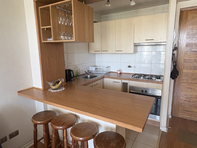 El departamento cuenta con un dormitorio amplio equipado con cama de dos plazas y escritorio, baño espacioso, living con futón, cocina completamente equipada con encimera a gas y horno eléctrico empotrado, además de una terraza con mesa para disfrutar la vista. Es un espacio soleado, funcional y listo para habitar.