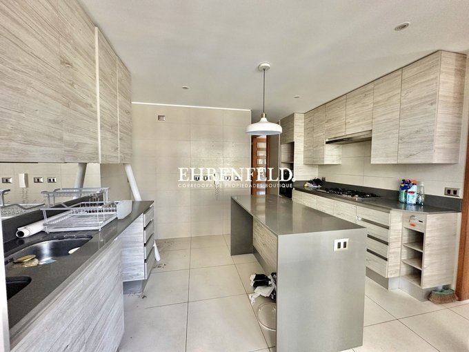 - Gran cocina con isla central, cocina encimera, horno, espacio para refrigerador dos puertas.