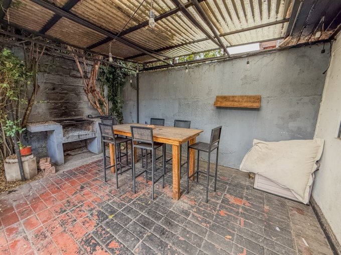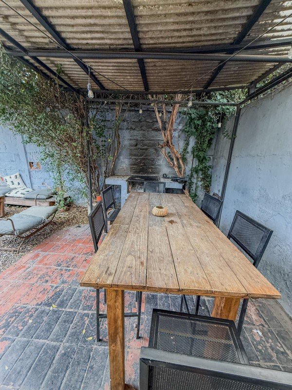 Jardin delantero y trasero, con quincho en obra y techo.