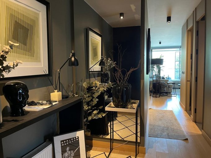 Altura de suelo a cielo de 2,6 m. Cocina con artefactos marca Gorenje, cubiertas Silestone, lavaplatos y grifería color negro marca suiza Franke. Equipada con encimera, horno eléctrico, campana, refrigerador panelable, horno microondas y lavavajillas.