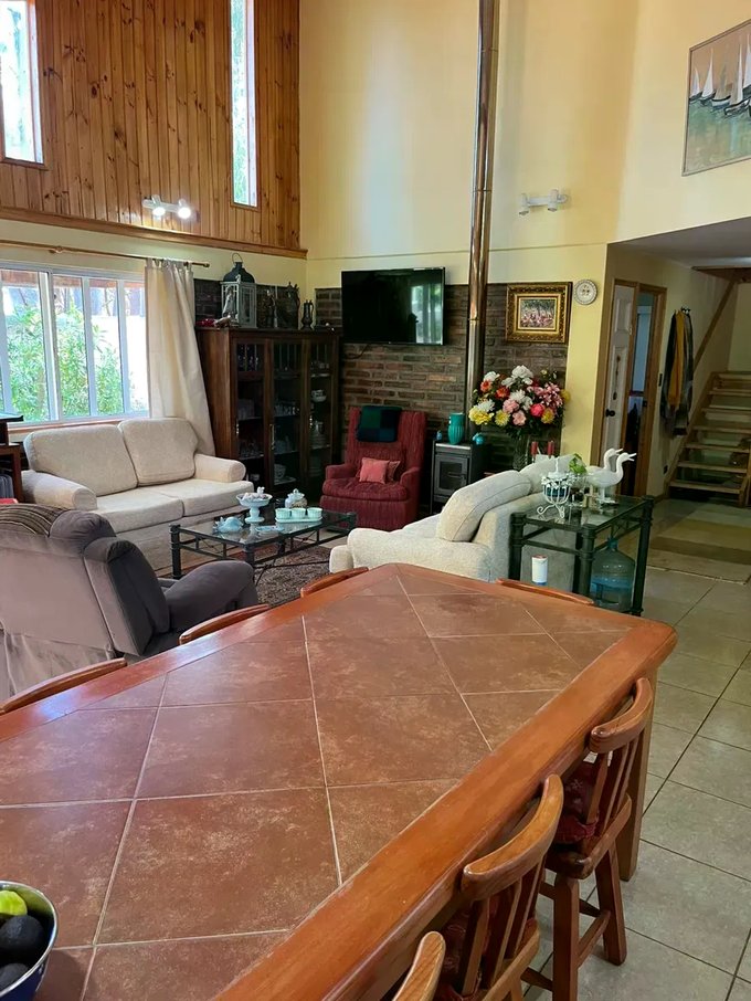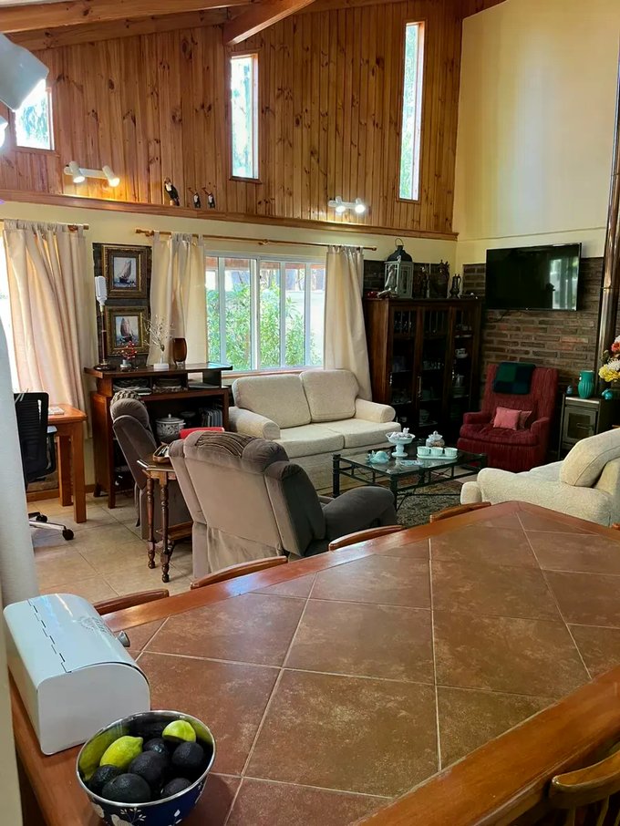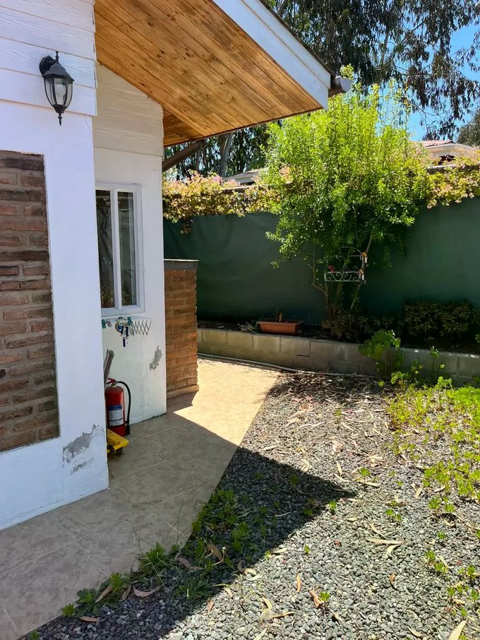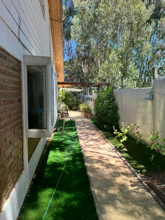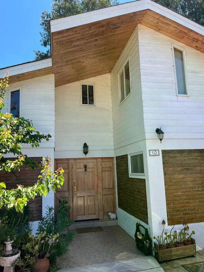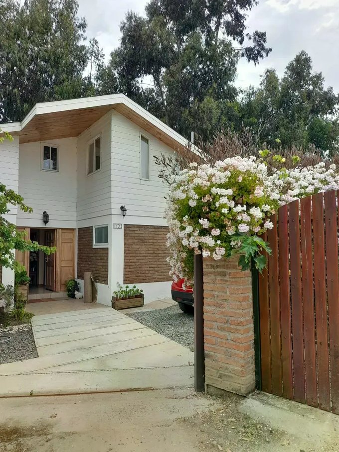 Casa ubicada en un entorno natural, rodeada de vegetación y con acceso mediante portón automático. La propiedad cuenta con una superficie total de 300 m² y una superficie útil de 126,51 m², distribuidos en dos niveles. El diseño exterior combina muros de ladrillo y revestimiento blanco, con detalles en madera en techos y aleros, aportando carácter y funcionalidad. El acceso principal se encuentra protegido y rodeado de áreas verdes y jardines, que incluyen espacios de descanso y terrazas techadas ideales para reuniones al aire libre.