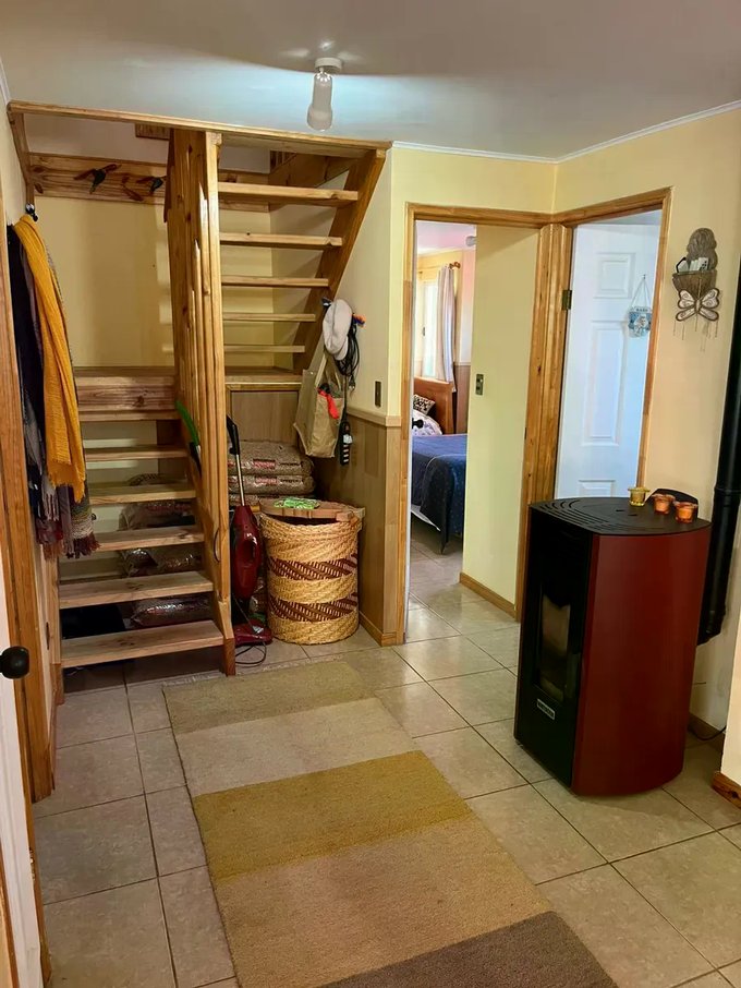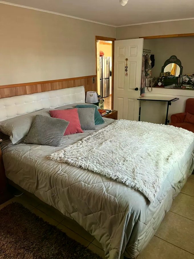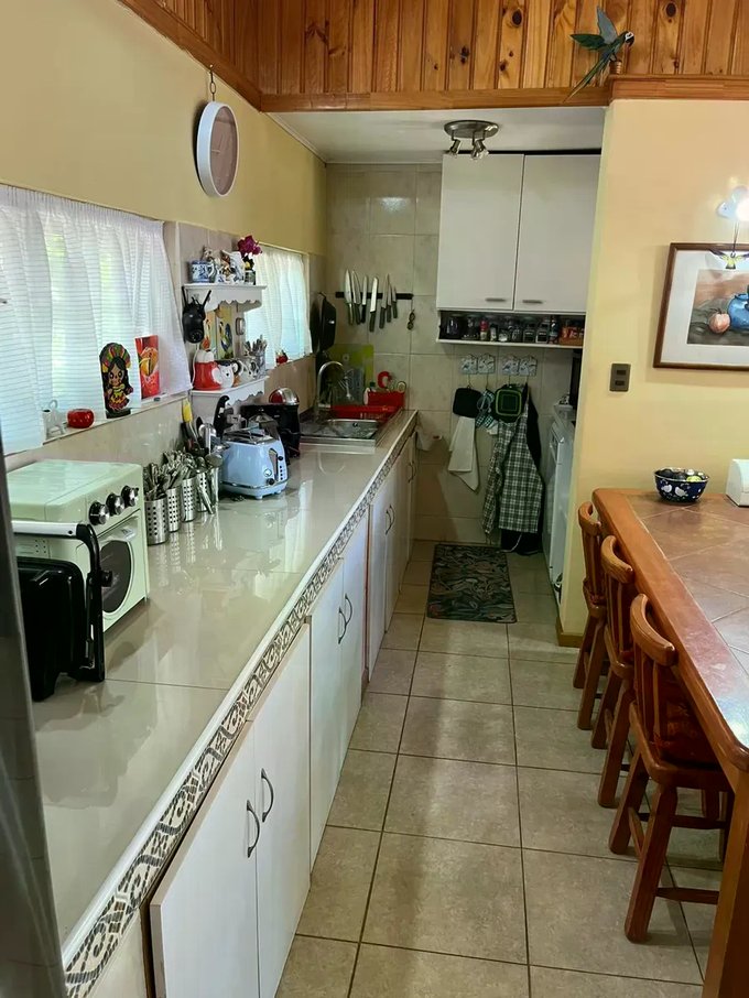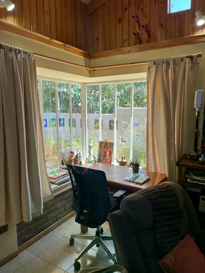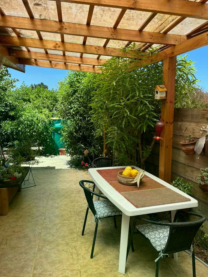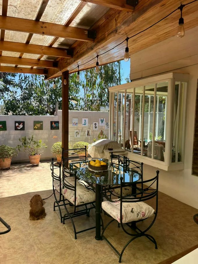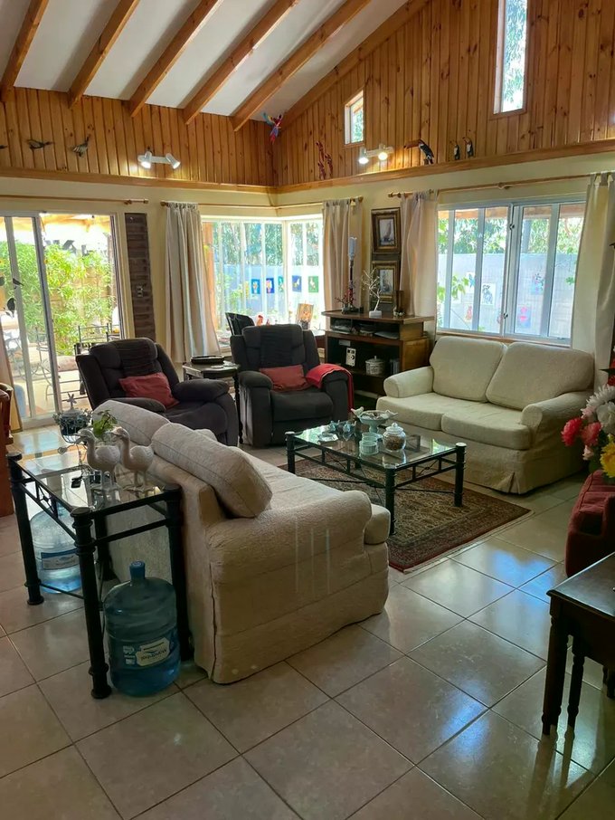 Casa ubicada en un entorno natural, rodeada de vegetación y con acceso mediante portón automático. La propiedad cuenta con una superficie total de 300 m² y una superficie útil de 126,51 m², distribuidos en dos niveles. El diseño exterior combina muros de ladrillo y revestimiento blanco, con detalles en madera en techos y aleros, aportando carácter y funcionalidad. El acceso principal se encuentra protegido y rodeado de áreas verdes y jardines, que incluyen espacios de descanso y terrazas techadas ideales para reuniones al aire libre.