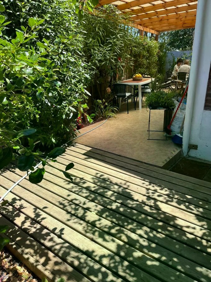 En el interior, la casa dispone de un amplio living-comedor con ventanales que permiten vistas al jardín y acceso directo a la terraza. La cocina está equipada y se integra al área social mediante una barra, facilitando la interacción en el espacio principal. El inmueble cuenta con tres dormitorios, distribuidos en ambos niveles, y dos baños completos. Los dormitorios ofrecen diferentes configuraciones y áreas de trabajo, adaptándose a diversas necesidades familiares.