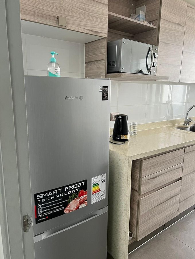 * Cocina amoblada con encimera eléctrica, horno eléctrico, campana, vajilla para 6 personas, ollas, refrigerador