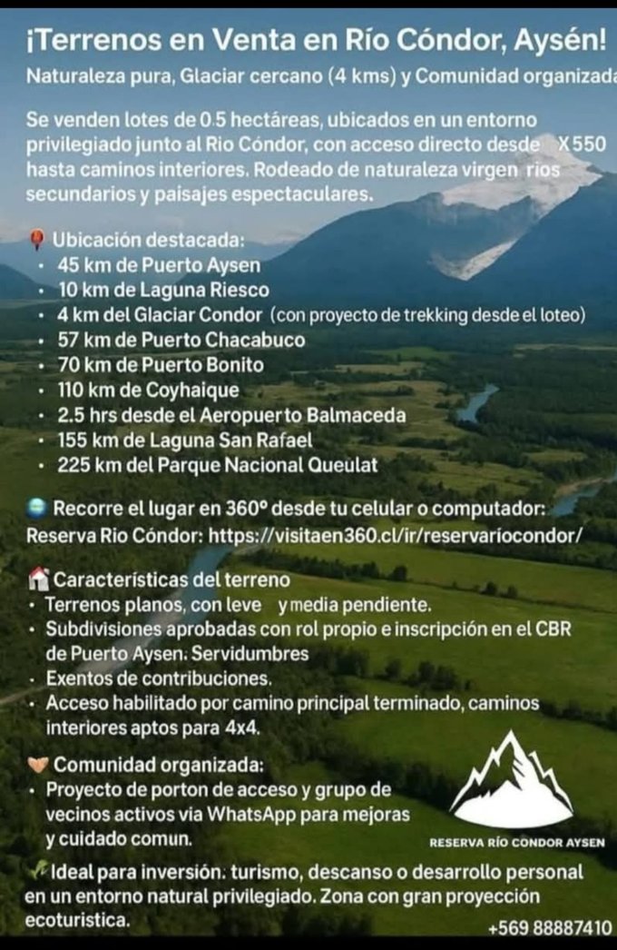 En venta terrenos en Aysén Reserva Río Cóndor, excelente oportunidad de inversión en un proyecto con entorno natural y tremenda proyección. Lotes de distintos valores. Todos con rol propio. Papeles al día. Con acceso controlado.