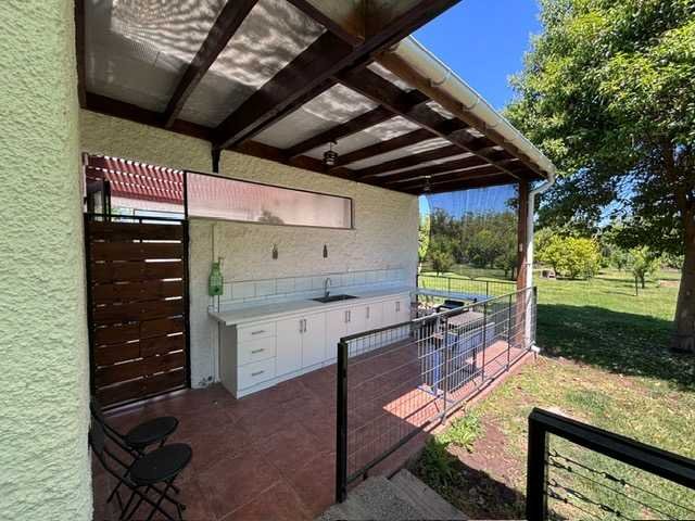 Terraza techada y quincho con mesón en L y lavaplatos.