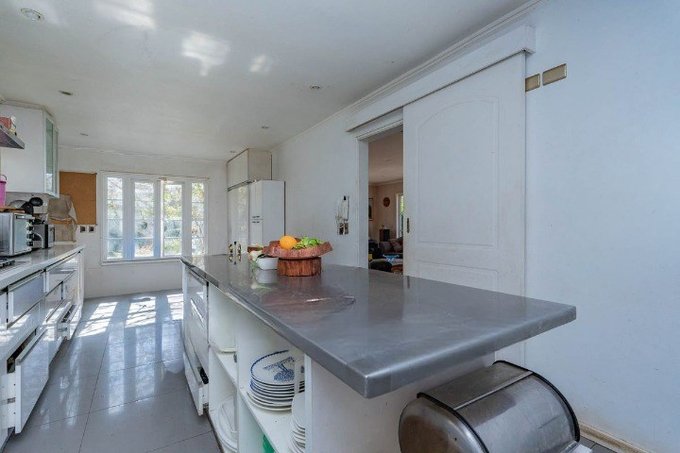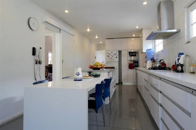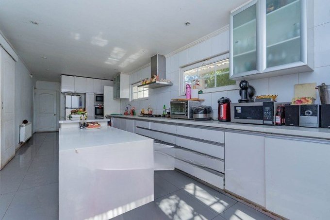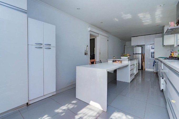 Cocina moderna de alto estándar con cubierta de silestone, isla en aluminio para manipulación segura de alimentos, horno y microondas empotrados.