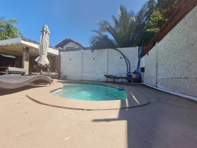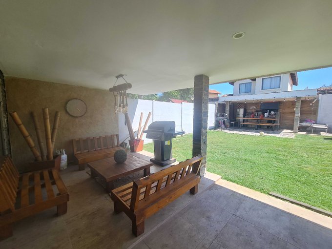 Terraza techada, quincho piscina, jardín formado.