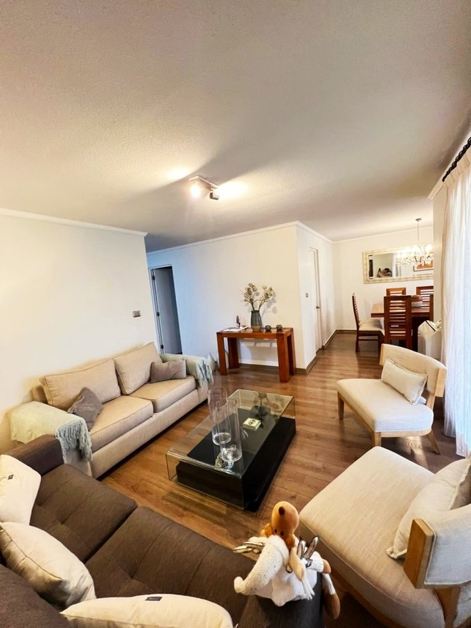 Living comedor con salida a amplia terraza cerrada con termopanel que tiene protección solar y acústica, con lindo quincho incorporado