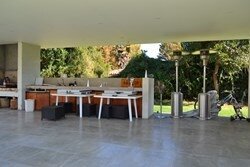 Gran Quincho techado con muebles, parrilla, cocinilla, lavacopas, frigo bar y conexión para TV.