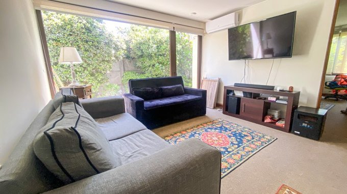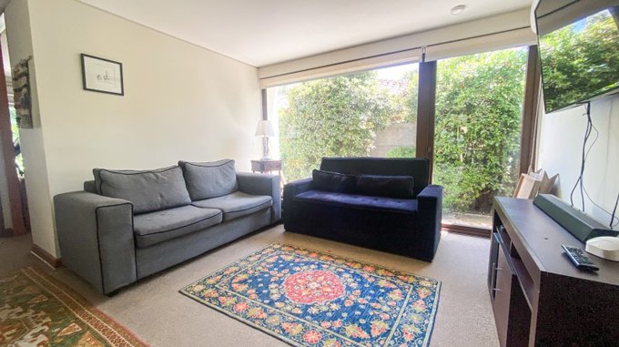 Sala de estar con salida al jardín, dos dormitorios de buen tamaño (uno de ellos ampliado) más un baño y otro dormitorio en suite.
