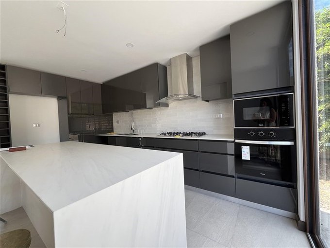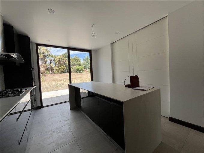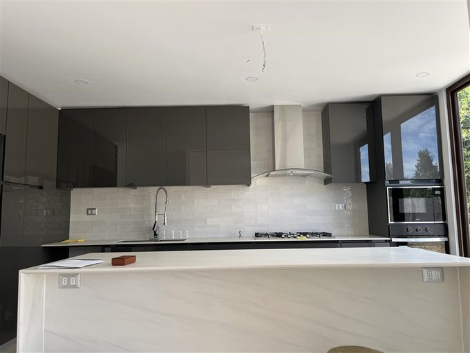 - Cocina integrada (separada por mamparas de living comedor) con isla y mesones de granito, encimera con 5 quemadores, horno empotrado, campana, horno convencional y microondas, conexión para lavavajilla y espacio para refrigerador side by side.