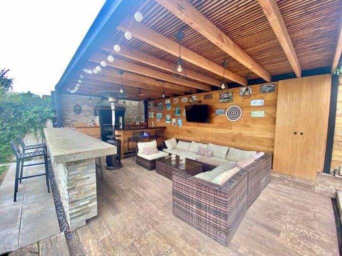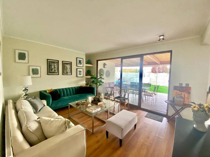 Casa de un piso con hall de entrada, sala de estar amplia, con espacio para salita de juegos o escritorio.