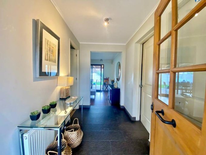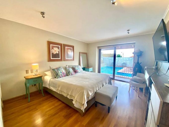 Dormitorio principal en suite con vista a la piscina y jardín y pasillo con dos dormitorios amplios que comparten un baño.