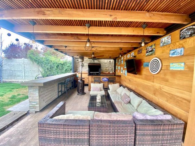Living comedor por separado con salida a una gran terraza, con quincho y jardín con piscina .