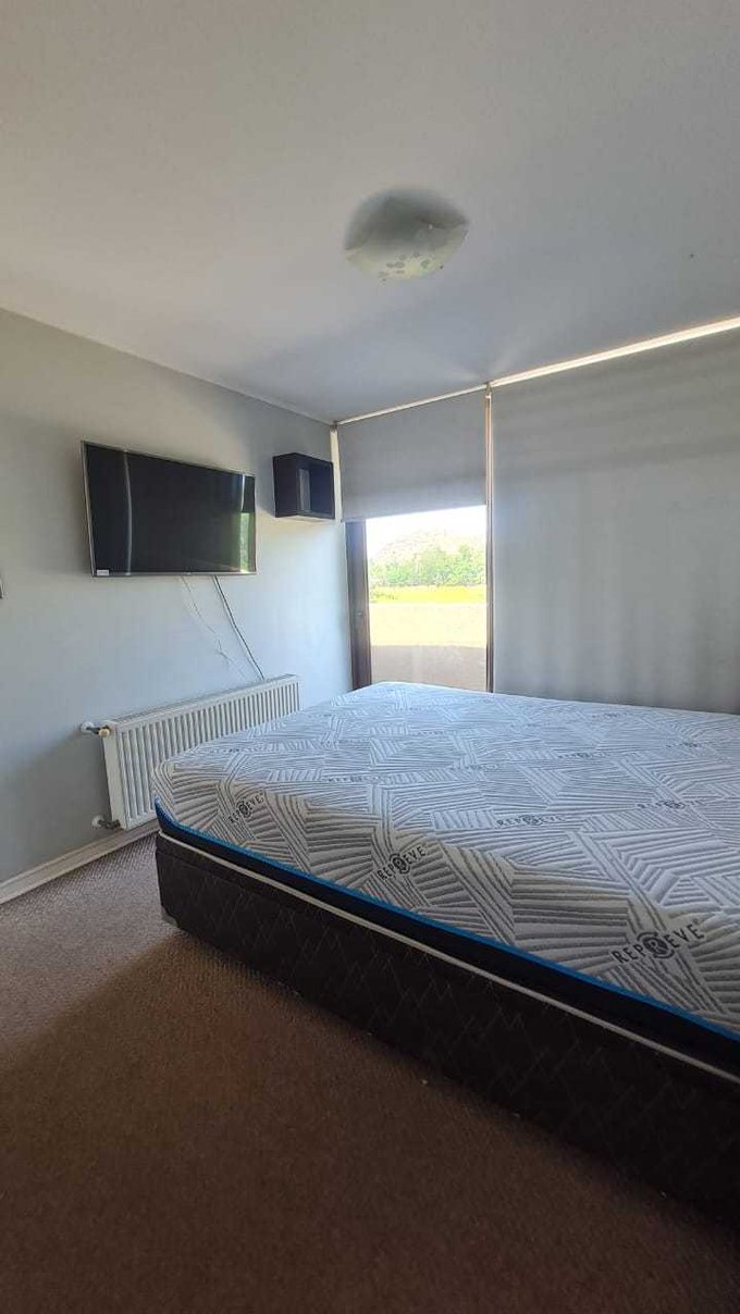 Gran sala de estar familiar con aire acondicionado, salida a balcón, un dormitorio en suite con baño completo y closet mural, otro dormitorio para dos camas mas un baño completo en pasillo.