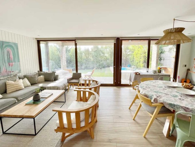 Equipamiento y exterior: Hall, Cocina, Comedor y Living con piso de porcelanto. Segundo piso, con piso flotante. Calefacción por losa radiante. Ventanas termopanel en toda la casa con marcos de PVC y folio madera. Piscina. Terraza techada. Jardín con riego automático.