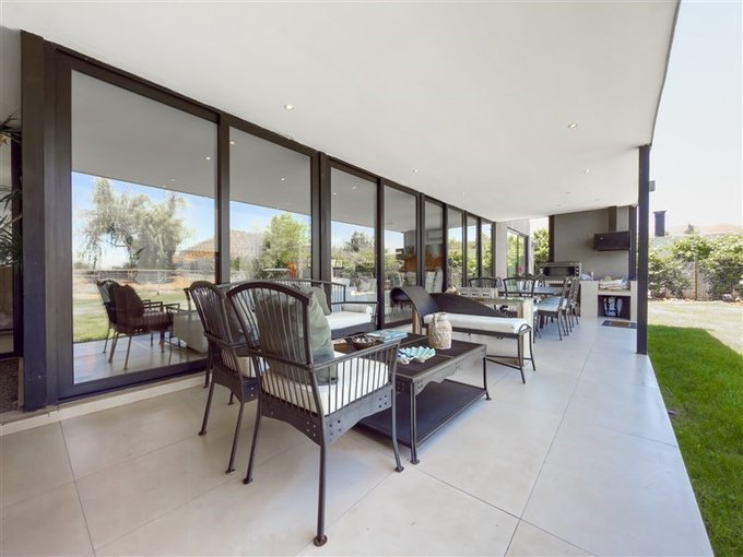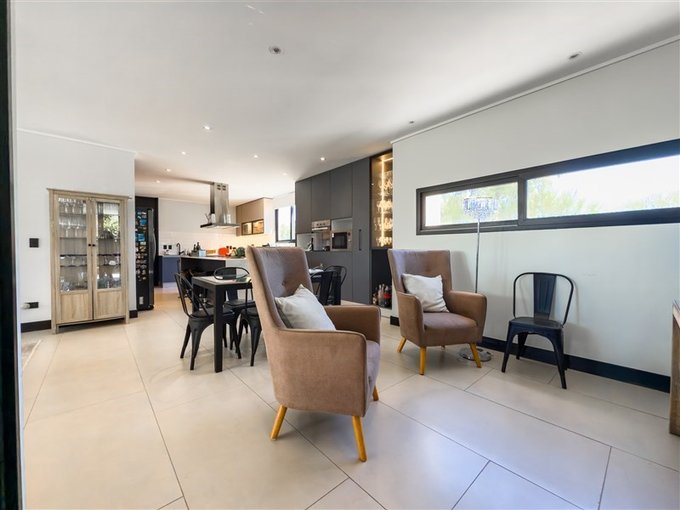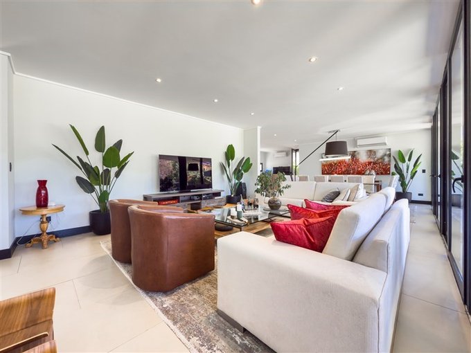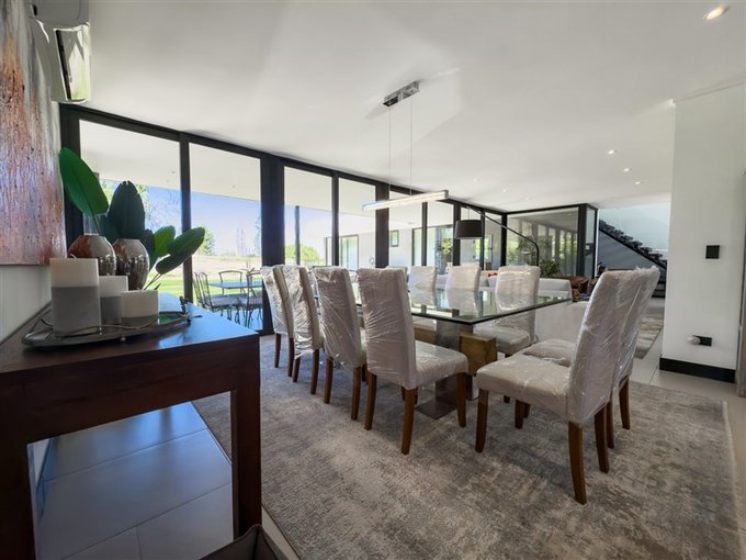 Amplio living y comedor con ventanales que enmarcan la vista al jardín y al campo de golf.